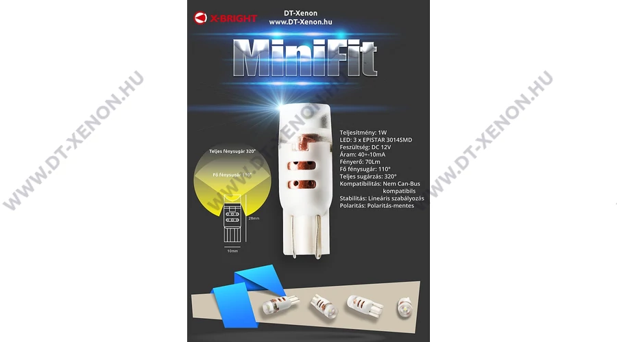 Optikával ellátott, T10/W5W foglalatba behelyezhető termék. A különleges optikai kialakításnak köszönhetően a termék a fényt szélesebb szögben sugározza, így olyan helyekre is alkalmas, ahol foncsor található.