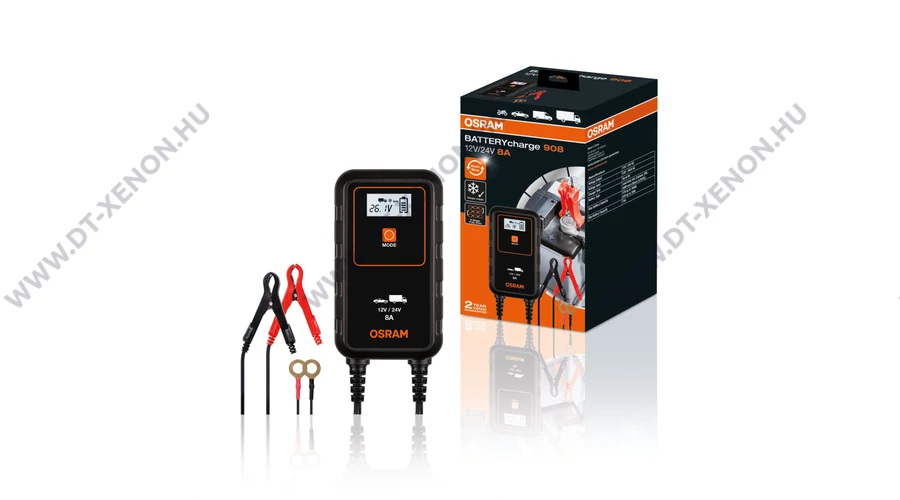 Az OSRAM BatteryCharger 908 egy 8 A-s okostöltő és akkumulátor szinten tartó eszköz 12 V-os és 24 V-os járművekhez, például a legtöbb személyautóhoz, kisbuszhoz és kisteherautóhoz. Egyetlen gombnyomásra fenntartja és tölti 7 fázisú töltési ciklussal a lítium akkumulátorokat, és csupán 9 fázisú ciklussal az ólom-sav/AGM akkumulátorokat. Háttérvilágítása LCD digitális kijelzővel rendelkezik, hogy gyenge fényviszonyok mellett is könnyedén használhassa. A biztonsági funkciók, például a fordított polaritás és a rövidzárlat elleni védelem a használó és a jármű biztonságáról is gondoskodik. Legyen nyugodt afelől, hogy a töltő szinten tartja az autó akkumulátorát. Ha a jármű akkumulátora eléri a teljesen feltöltött állapotot, az eszköz automatikusan szinten tartási üzemmódra vált.
