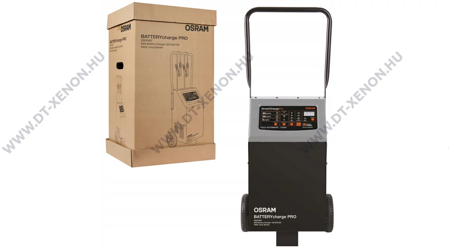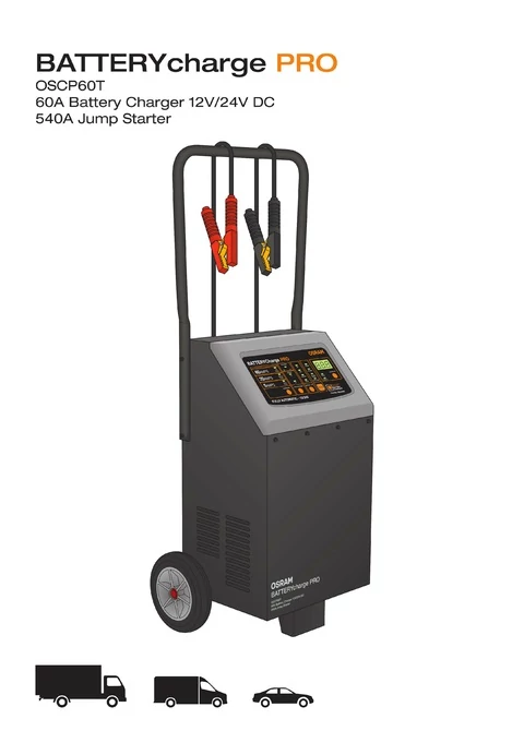 Az OSRAM BATTERYcharge PRO 60A egy professzionális, intelligens akkumulátortöltő a 12 V-os és 24 V-os járművekben használt széles körű akkumulátortípusok részére. A töltőkészülék ideális a karbantartott, különböző típusú járművek és akár teljes flották esetében, különösen a professzionális műhelyekben, illetve bemutatótermekben.A különböző akkumulátortípusok és töltési szintek kiválasztásával a felhasználó a különböző típusú akkumulátorokhoz szükséges töltési beállítást alkalmazhat. A BATTERYcharge PRO 60A eltérő töltőáramot képes biztosítani 60 A-ig. Ez az ólom-sav akkumulátorok, lítium akkumulátorok (AGM, GEL, STD, EFB, LFP, LiFePO4) és start/stop akkumulátorok esetében lehetséges. A maximum 60 A-ig terjedő eltérő töltési sebesség lehetővé teszi a lassú, illetve gyors töltést is a felhasználók egyedi igényeinek megfelelően. Az akkumulátortöltési funkción túlmenően a BATTERYcharge PRO 60A integrált vészindítási funkcióval rendelkezik. Az OSRAM integrált LCD kijelzővel ellátott professzionális akkumulátortöltője 7 szakaszos töltési ciklust végez lítium akkumulátorok és 3 szakaszos ciklust minden egyéb akkumulátor esetében, hogy helyreállítsa és optimalizálja az akkumulátor teljesítményét és javítsa a töltés fenntartását. A berendezés tetején elhelyezett fogantyú és a kerekek biztosítják a kényelmes hordozhatóságot és az OSRAM professzionális töltőjének könnyű szállítását a műhelyben.