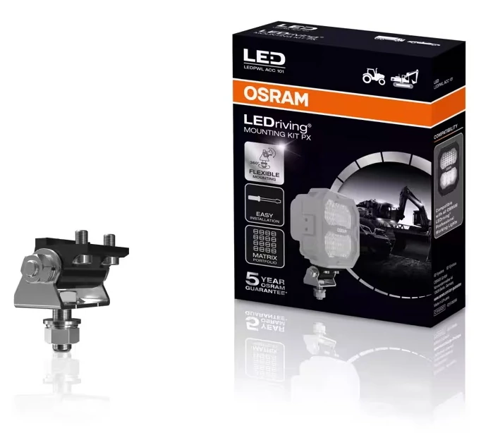 Az OSRAM LEDriving PX professzionális munkalámpa választékkal mostantól speciális szakmai feladatok és alkalmazások széles skálájához pontosan megtalálható a megfelelő világítás. Ráadásul a lámpák háromféleképpen is felszerelhetők: Közvetlen, szabványos rugalmas vagy nagy teherbírású felszerelési eljárással. Az OSRAM kifejezetten erre a célra szerelőkészleteket és egy DT-csatlakozóval ellátott kábelt fejlesztett ki. A különösen rugalmas összeszerelést lehetővé tevő LEDriving PX szerelőkészlet a professzionális PX család összes OSRAM LEDriving munkalámpájával kompatibilis. A járműre egyetlen központi csavarral rögzíthető, gyorsan és könnyen felszerelhető, és gyorsabbá és könnyebbé teszi a LEDriving professzionális (PX) család telepítését is. A szerelőkészlet minden alkatrésze rozsdamentes acélból készült, rezgésállóságuk legalább 8g rms, mindennapi használatra tervezték építkezési járművekre, traktorokra stb. Továbbá a konzol dőlésszöge akár +/- 15 fokban is állítható, illetve 360°-ban elforgatható, hogy a munkalámpa fényét a megfelelő pontra irányíthassa.
