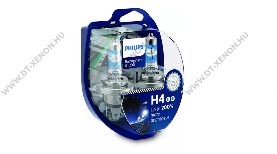 A Philips RacingVision GT200 H4 halogén izzók akár 200%-kal több fényt vetítenek az útra (hagyományos izzókkal összehasonlítva). A nagyobb fényerő miatt jelentősen hamarabb észlelhetők az akadályok és veszélyek - ez további időt ad a reagálásra, ami életeket menthet! A GT200 a törvényi minimumban előírtnál 80m-el messzebb világít, azon a pont még 1lux megvilágítás mérhető az útfelületen.
