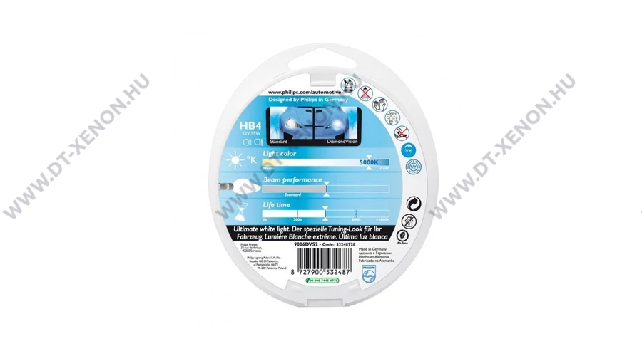 Német gyártmányú PHILIPS DiamondVision 9006DV gyári számú, HB4 foglalatú halogén izzó.